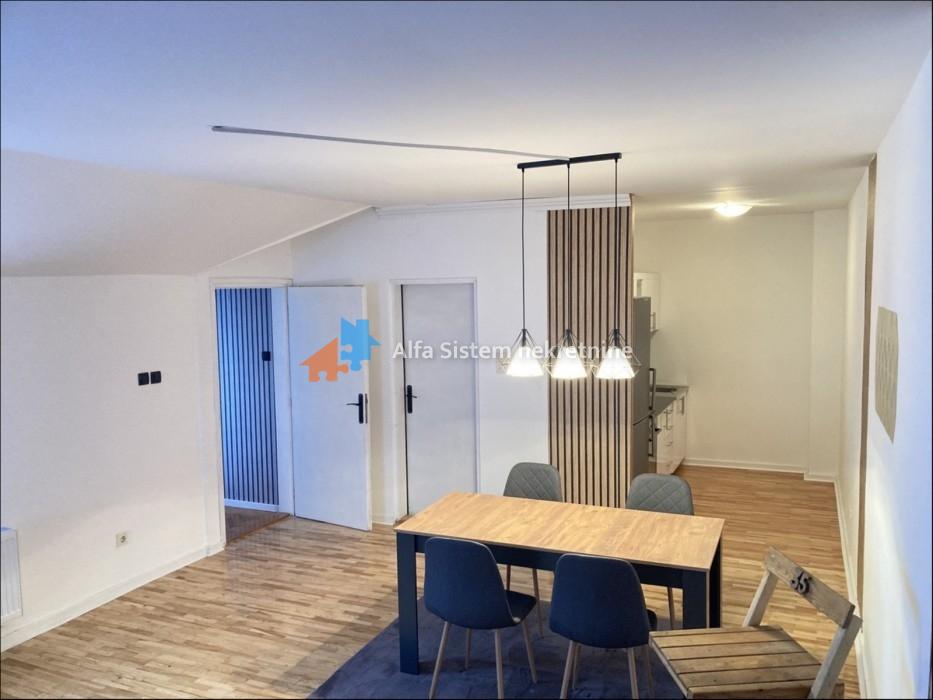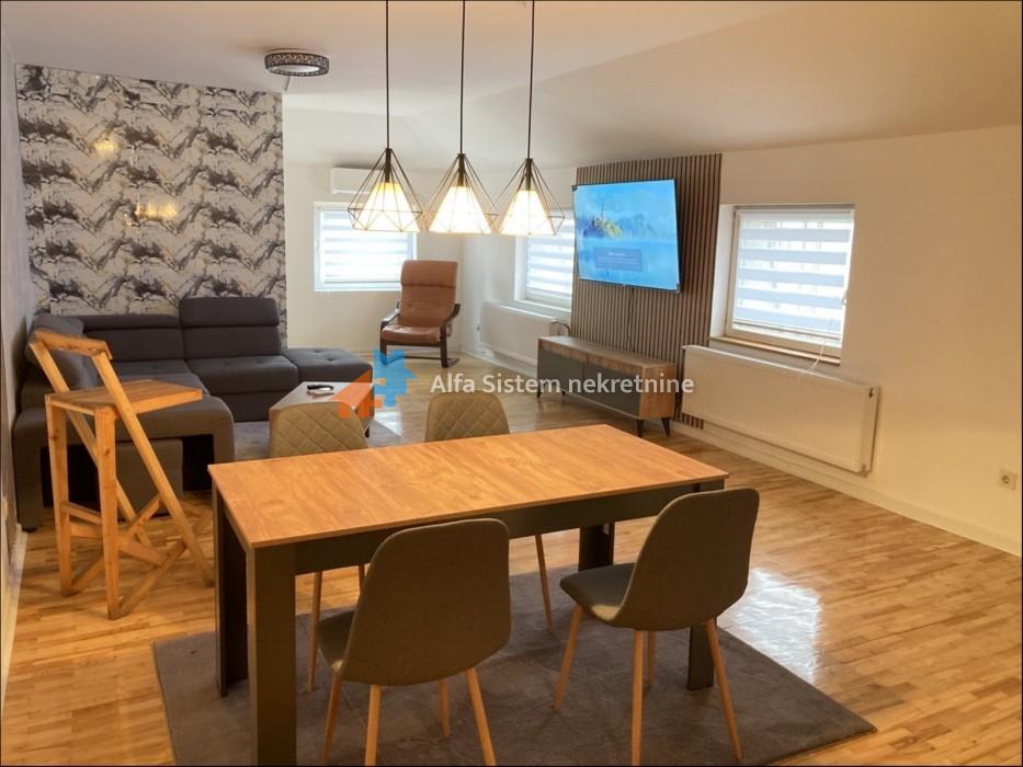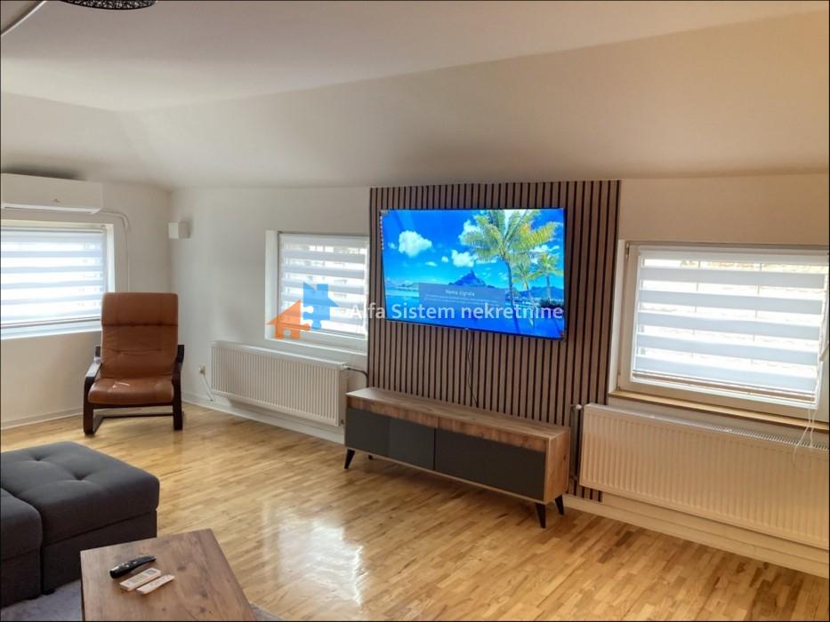 Sastoji se od velikog open space dnevnog boravka sa kuhinjom i trpezarijom, spavaće sobe i prostrane terase. Kompletno je namešten novim nameštajem – nikada korišćen.