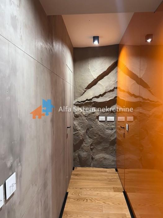 Enterijer i oprema: Stan je osmišljen i opremljen s posebnom pažnjom na detalje, korišćeni su najkvalitetniji materijali – mermer, granit, medijapan, kao i ručno rađene zidne tehnike.