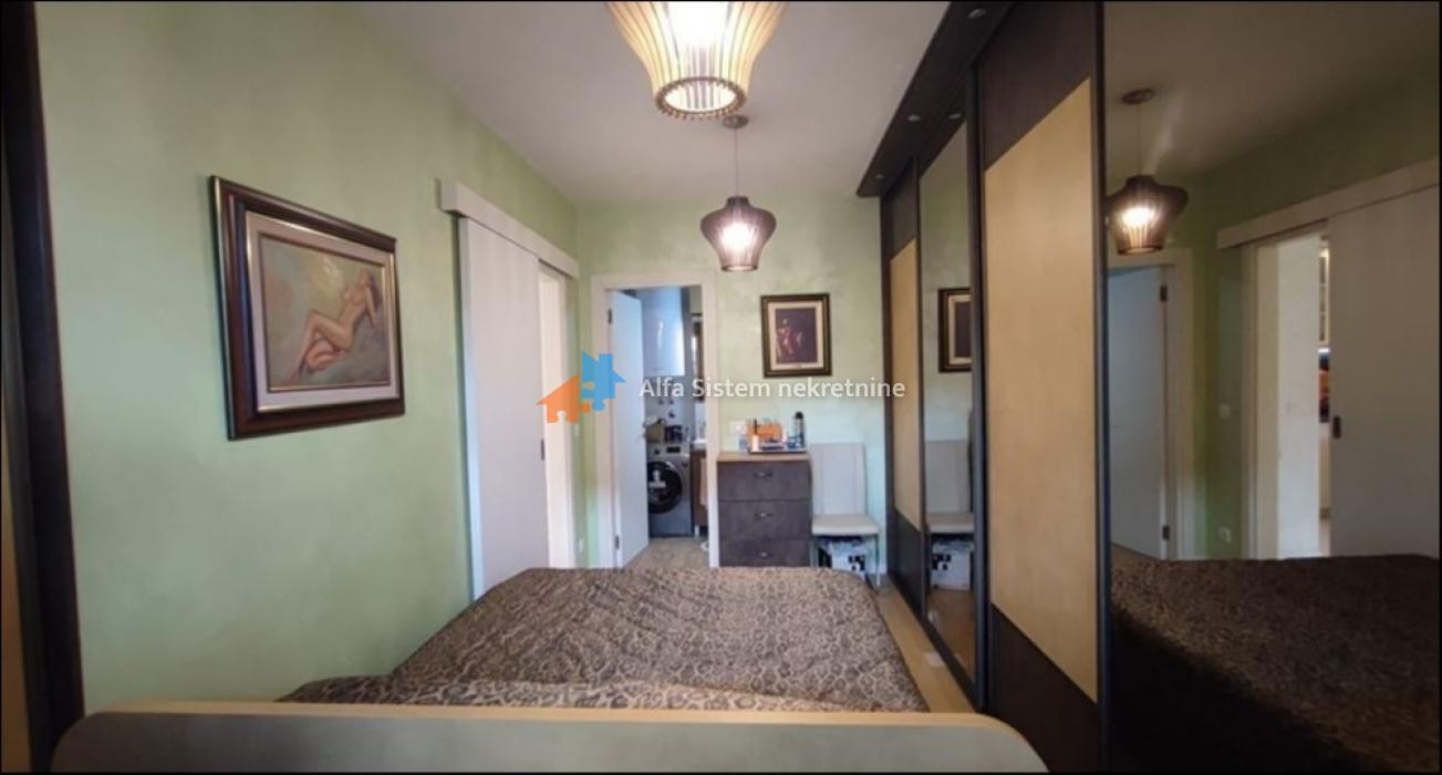 Stan se nalazi na visokom prizemlju (formalno prvi sprat) moderno projektovane zgrade sa recepcijom, obezbeđenjem 24/7, video nadzorom i liftom. Izuzetno je funkcionalno koncipiran – dnevna soba, trpezarija i kuhinja povezani su u otvoren prostor, dok se u odvojenom delu nalaze dve spavaće sobe, od kojih je jedna master sa sopstvenim kupatilom. Stan poseduje i dodatno kupatilo.